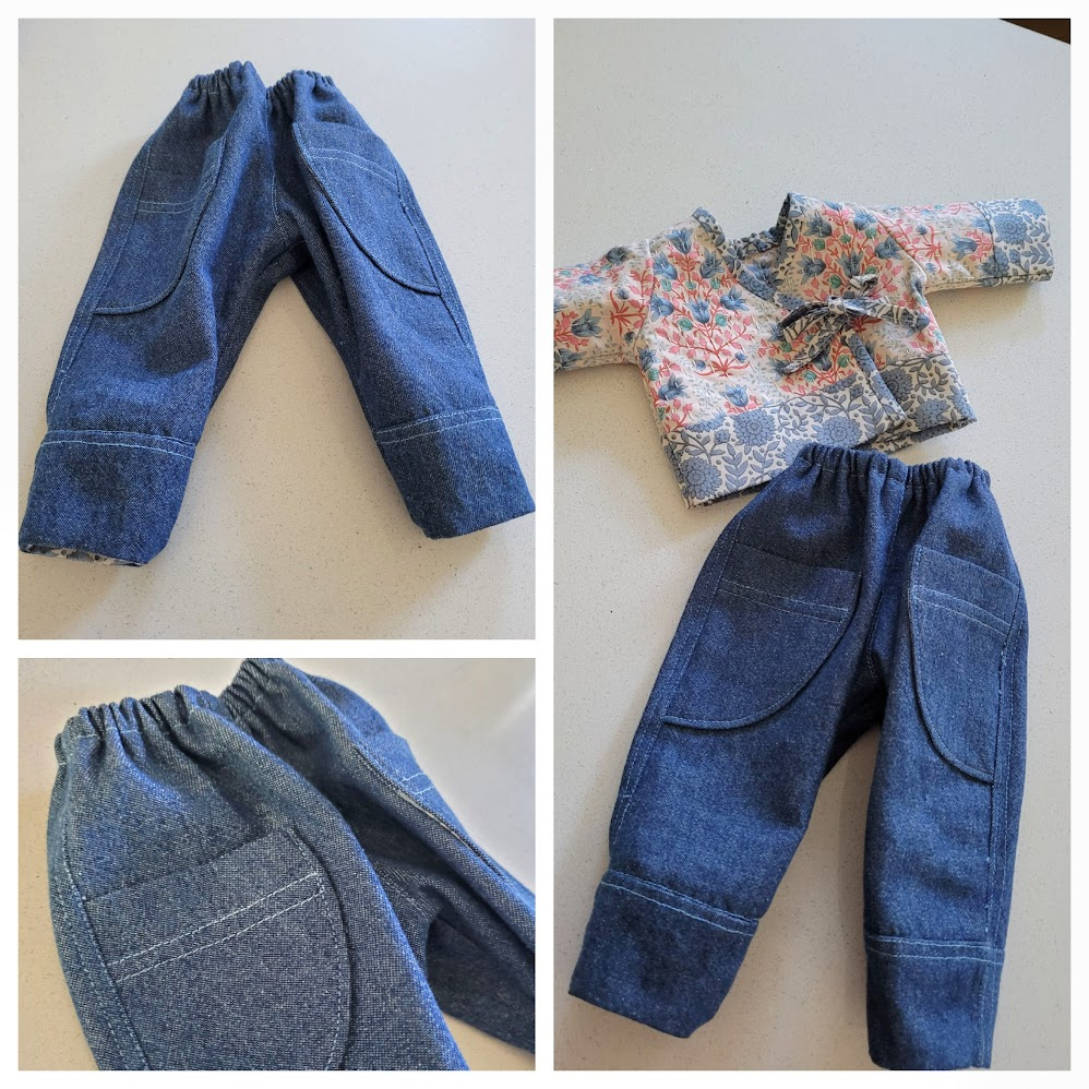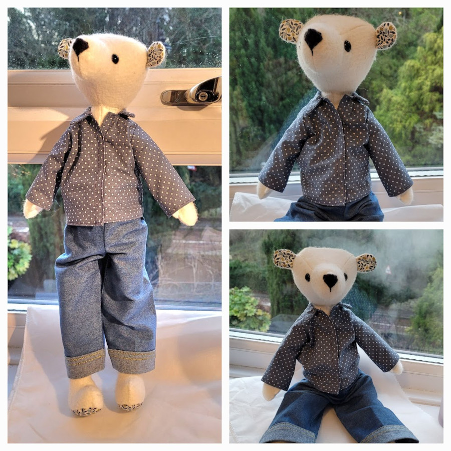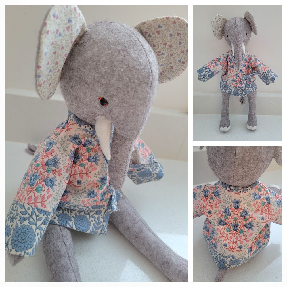 before travelling to see the grandgirlie in question. But with a truly concerted effort I managed to make the jacket in about six hours - I'd be no good on The Sewing Bee if it takes that long for me to stitch such a small garment. Next morning it was the turn of the barrel leg jeans - I thought these will only take a couple of hours... Ha Ha! got about half way through stitching and my sewing machine has an enormous hissy fit with the tension and I really struggled to put it right. Yes there were a few naughty word uttered. But eventually I got the thread tension sorted out and the clothes are complete. I have to say, despite machine difficulties I really enjoyed making Uma, and her clothes are just beautiful. Sarah Peel does such a fabulous job in her designs, and the instructions for making up items are brilliant. It's going to be a struggle to give her up - perhaps I'll make another one for me... or will it be another two, someone else I know likes elephants...