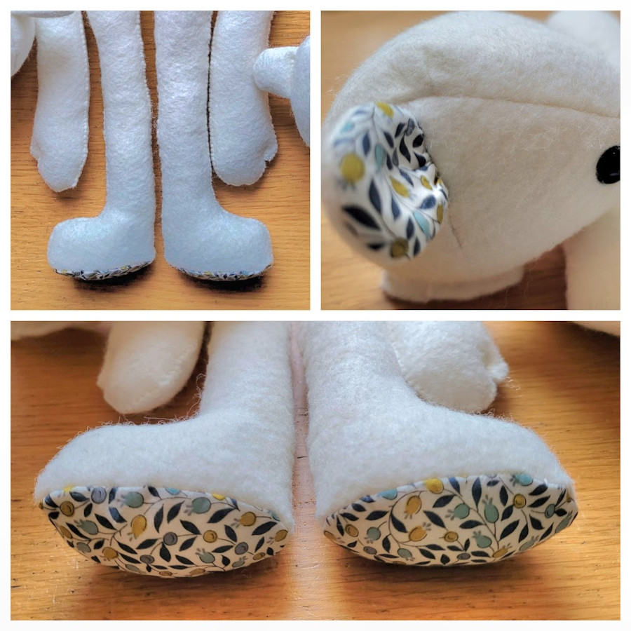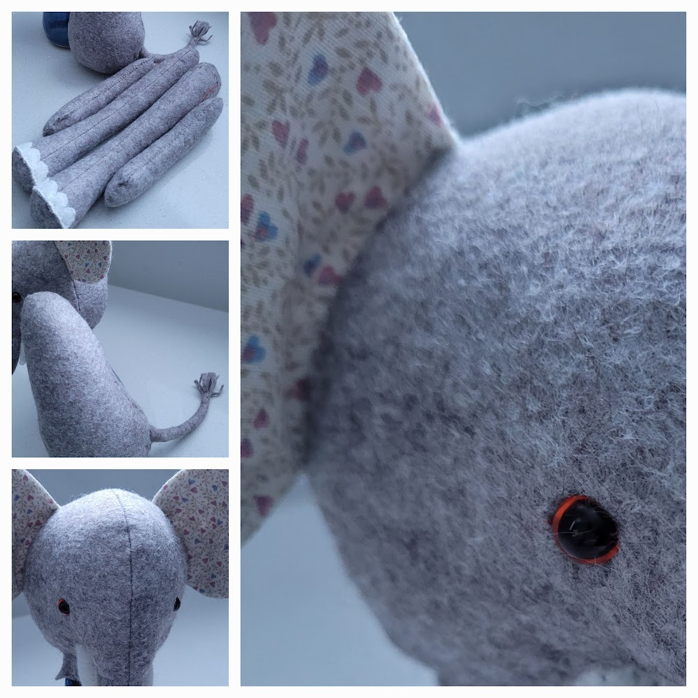 Making this character was a bit different from my usual method. In making Uma I used much more machine stitching. Partly because I was on a very tight deadline and because the head with trunk and very large ears needed to much be more secure. I also machine sewed the front seam of the legs. The rest of the body was hand stitched.