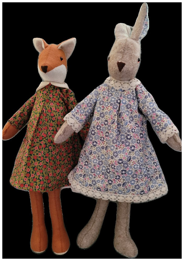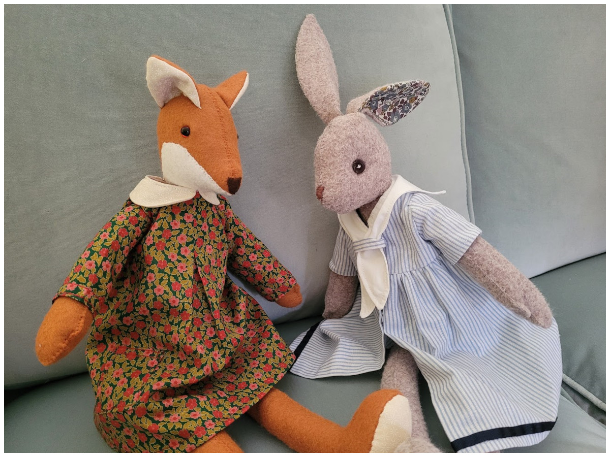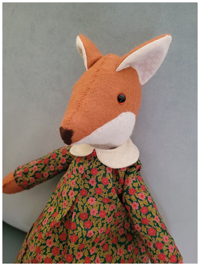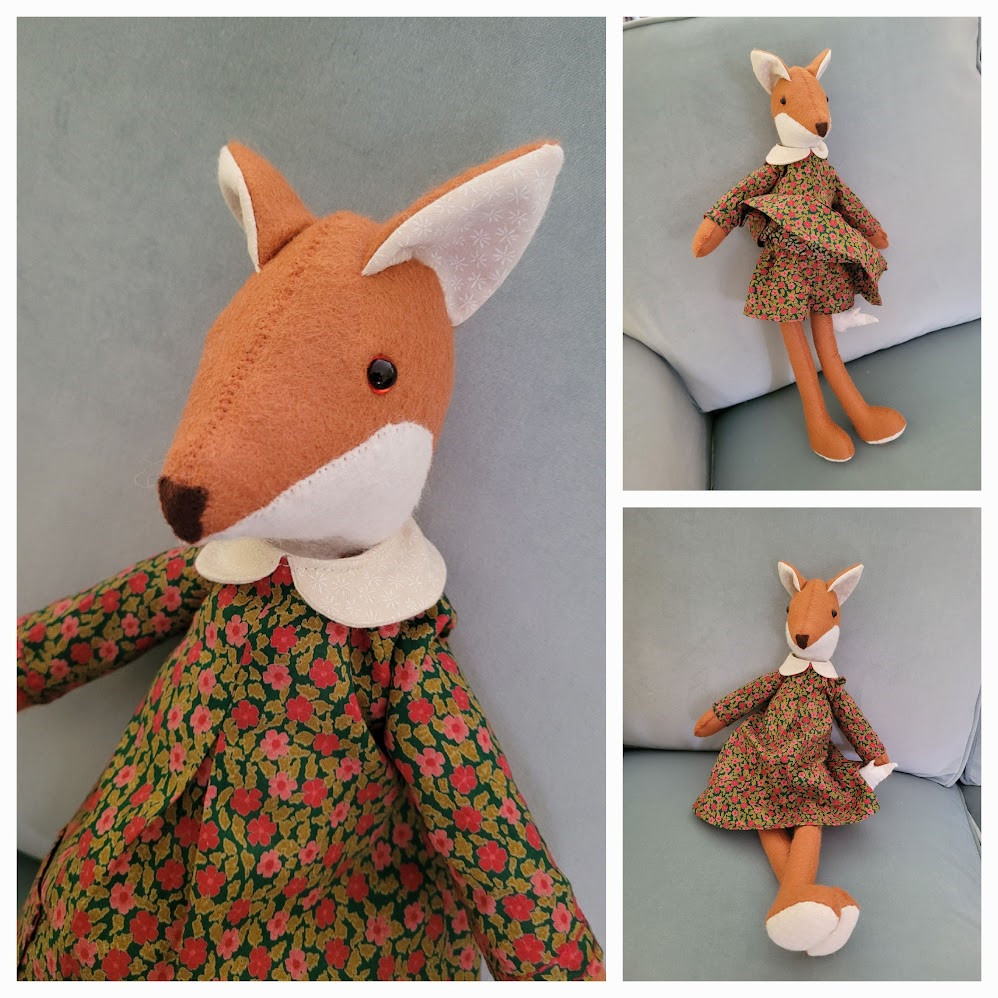 Completed May 2024. Foxy Loxy is dressed in a vintage Tana Lawn fabric. The is the full version of the Polka Dot pattern dress, with collar and patch pockets. She has matching shorts. Foxy's ears, foot pads and the collar of her dress are a matching cotton print. She is all ready to go to London for the youngest gorgeous granddaughter. Luna needs to make sure Foxy is ready to leave home with Luna II..