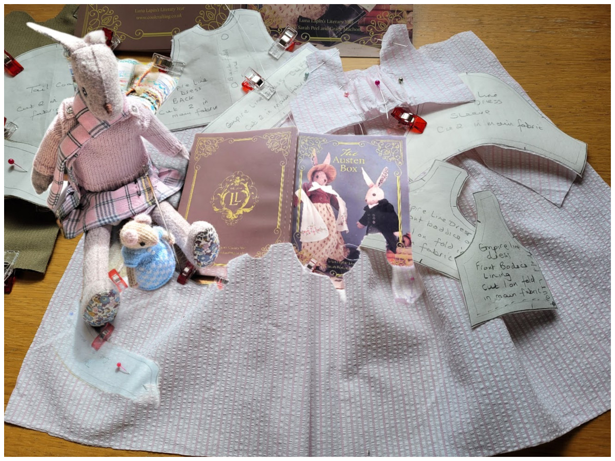 It's Wilhelmina's turn at long last. July 2024, and it's time to get the Jane Austen inspired box from Luna's Literary Year out of the cupboard. I was a bit nervous for The Outfit, what if I mess it up! However, having practised on Luna, I have to do it, just get on with it... Cut into those lovely fabrics, what can go wrong? Don't let the spacing on the box pleats defeat you!, you can do the gathering on the bodice, you won't stitch the sleeve on the wrong side of the armhole... I leave it to your imagination to guess how many times I tried with the pleating, and if I did have to unpick the sleeve...
