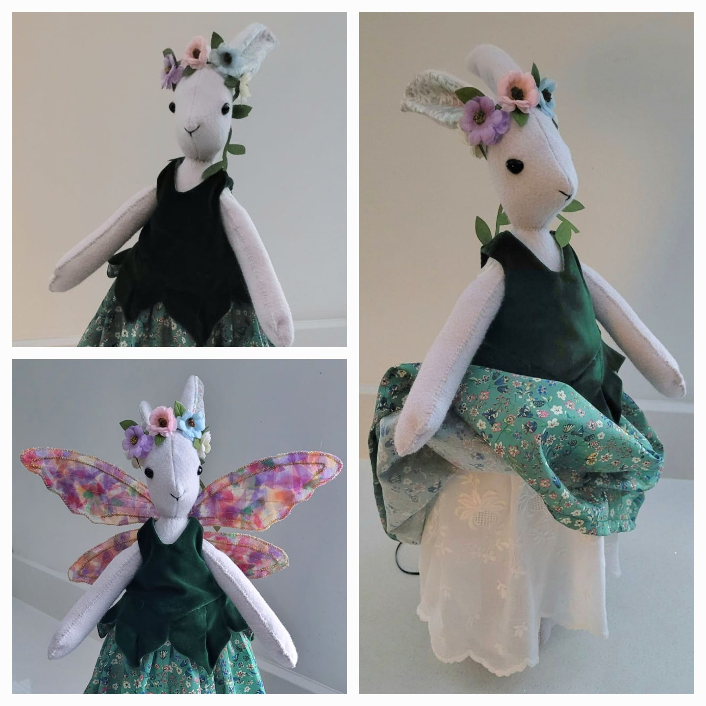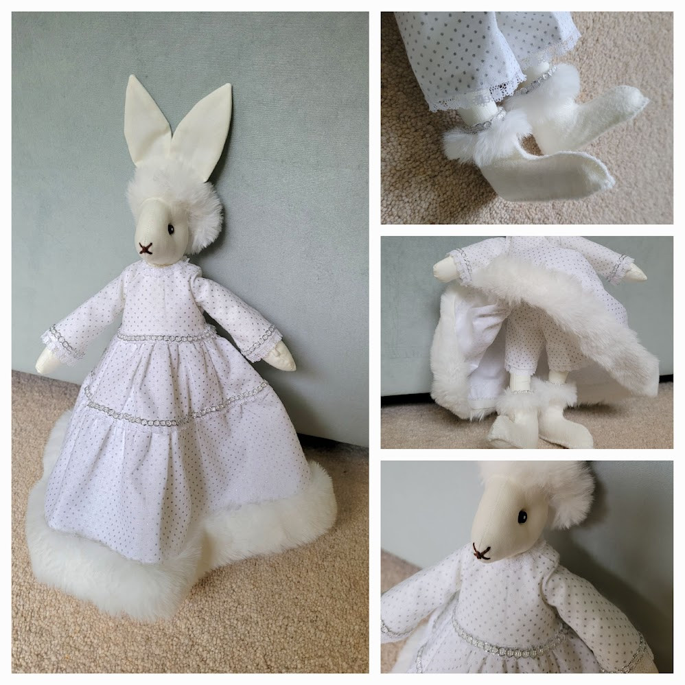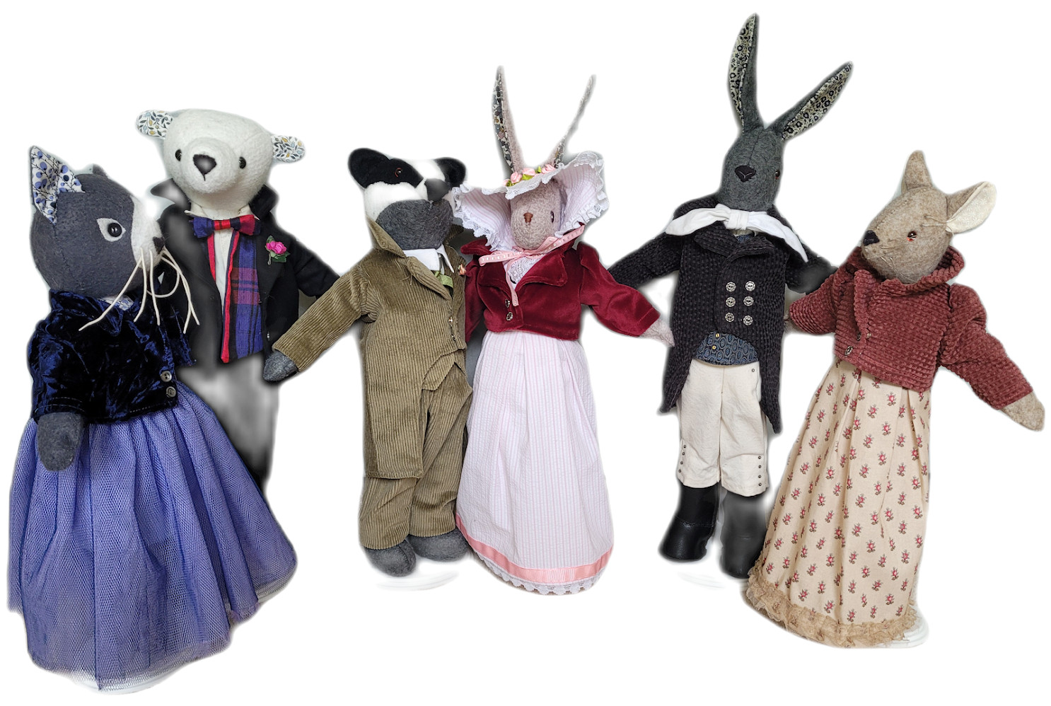 I made my first purchase for Luna in 2020, but I didn't actually make her until 2022. More purchases followed... Erik and Clementine came along in 2023. By July 2024 it became necessary to start a massive CoolCrafting stitchathon to work through some of the boxes and kits that were lurking in the cupboard. Two new chums and six outfits were completed, here they all are dressed up and ready to go the Rabbitty Summer Ball: