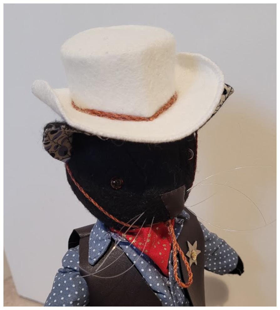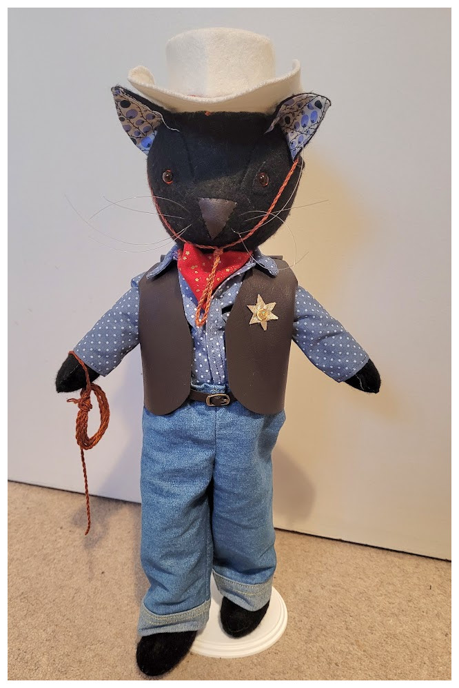 Cowboy Cat... My younger step daughter said, "Oh could I have a black cat please?, and could he be dressed as a cowboy?". He is based on Sarah Peel's Clementine Cat pattern from CoolCrafting. My black felt seemed to be a little bit 'thin' so I used iron-on light weight vilene as a stabiliser. I had forgotten how tricky the head and ears are to stitch, and they are even more tricky when everything is completely black! The nose was also tricky and took several attempts to get correct. Eventually I used a piece of the dark pleather to give a bit of texture and contrast on his face. The outfit comprises jeans and a spotty shirt, a pleather waistcoat (all adapted from 'Alfie's' patterns). I made a belt, neckerchief, lassoo and a Stetson to complete the outfit. It took three attempts to make a Stetson that looked reasonable good. How big is that cat's head???, then realising iron-on pelmet vilene instead of bonda-web for the stiffening on the crown and rim would be a good idea. Eventually I am happy with it (hubby's Tilly hat was a very handy a guide for the shape). Phew! Cowboy Cat is ready for a certain small grandson's extra Christmas present.