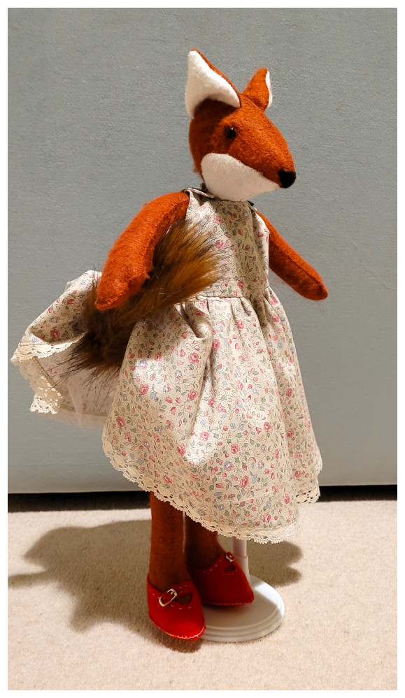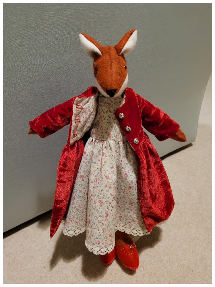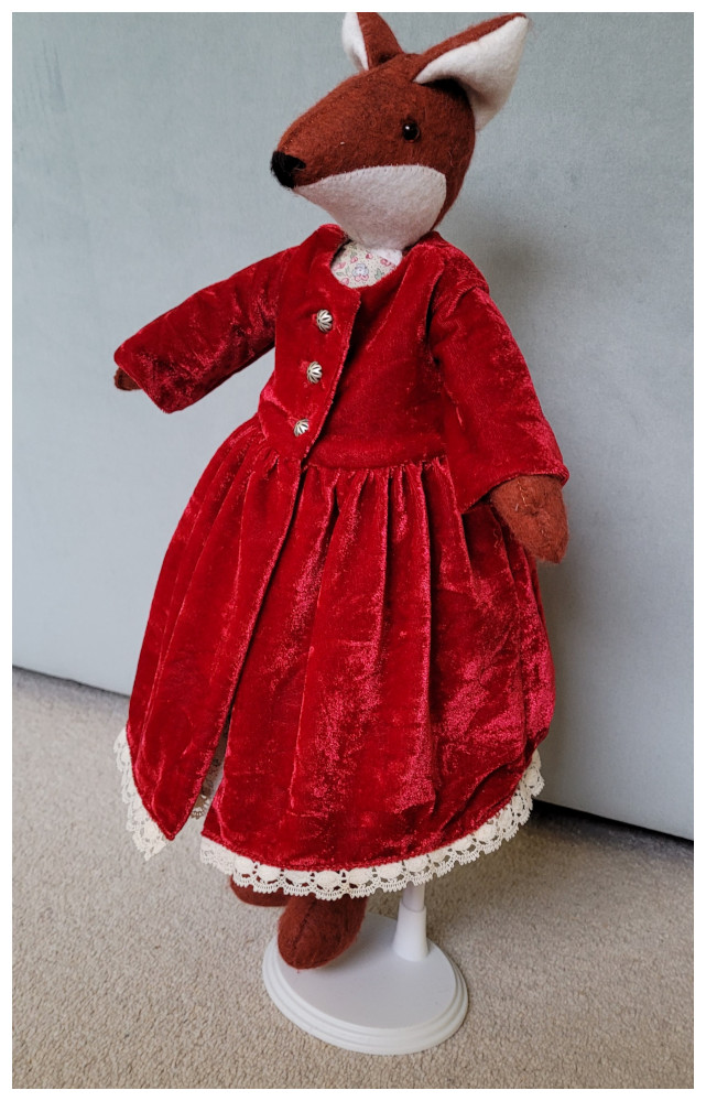 My sister-in-law also wanted a lady fox as companion to Reynard. In January 2025, Victoria Vixen was completed, as a surprise birthday present. Her outfit comprises the Twirling Dress in a delicate rose and floral fabric trimmed with lace at the hem, she has matching shorts in the same fabric. She has a scarlet velvet Opera Coat (from Freya's wardrobe), lined with the same floral fabric and trimmed with lace at the hem. The outfit is completed with a pair of scarlet felt shoes. I am quite a convert to making proper buttonholes on coats and jackets now, and have used them on the shoulder tabs of the twirling dress.