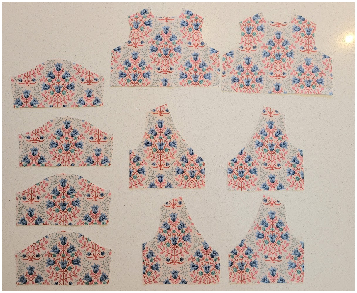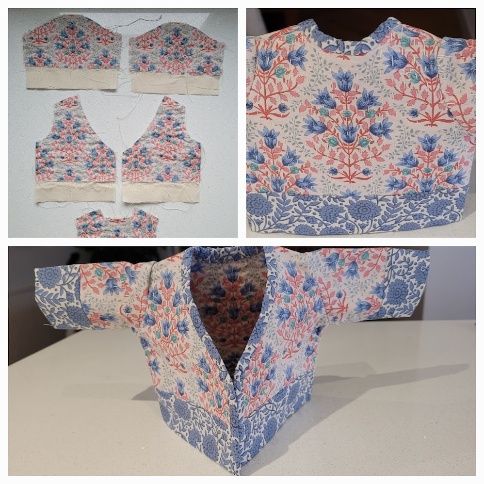 On to the clothes. I already had some beautiful Tilda fabric in may stash so finding suitable fabrics for the Kantha Jacket was not a problem. However, I wanted to place the main floral motif in prominent positions on each section. With so many small pattern pieces this was quite tricky. Eventually I managed. Then it was onto the Kantha stitching though three layers of fabric. At one point I thought I'm never going to get this