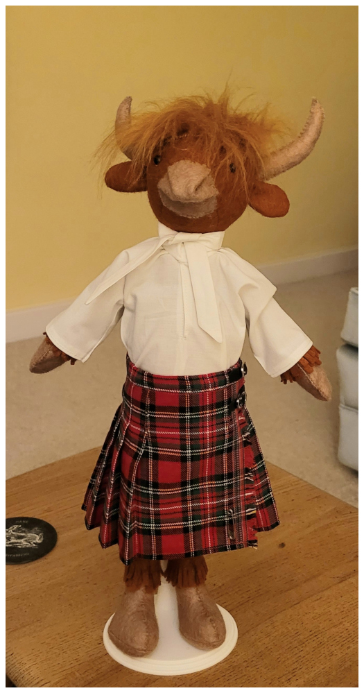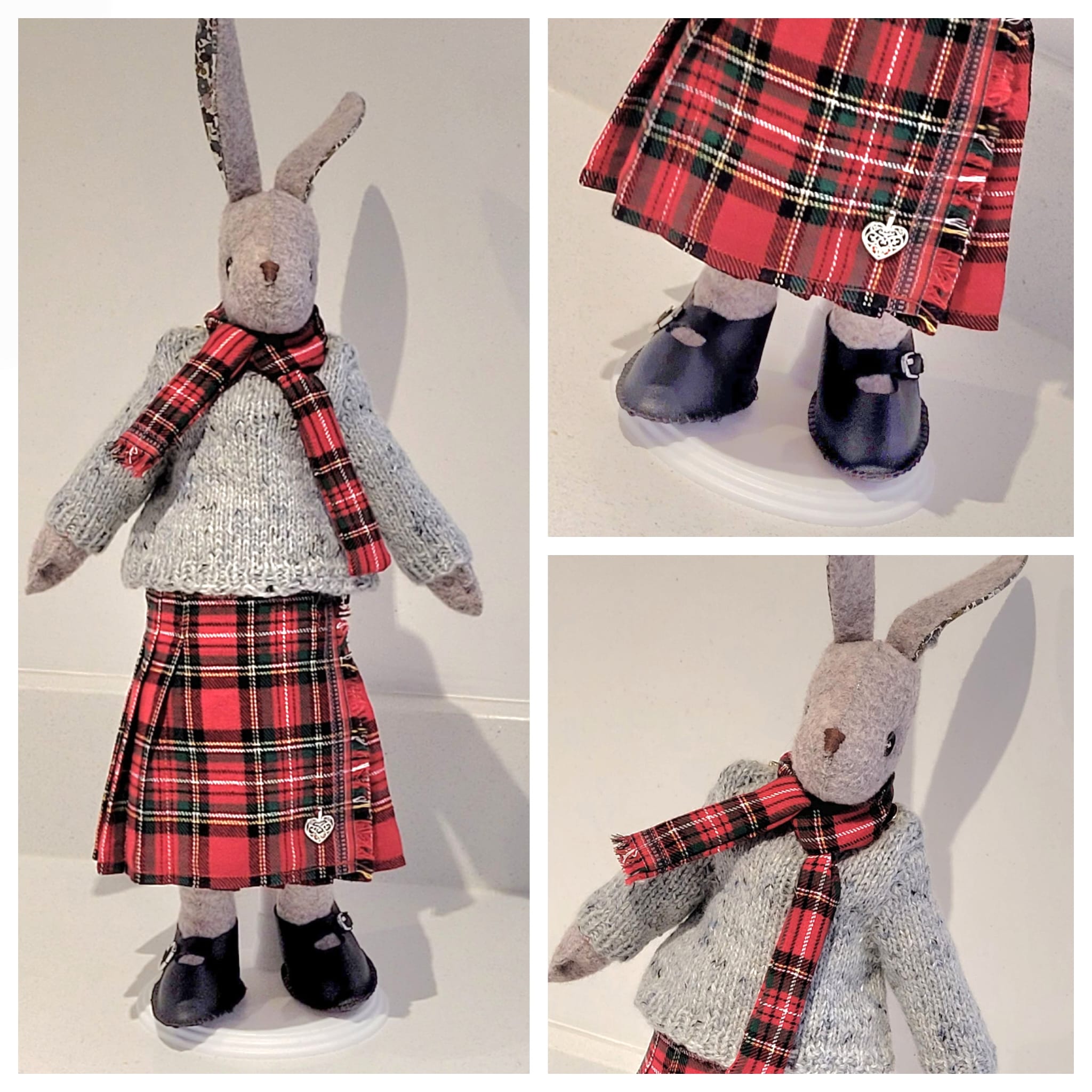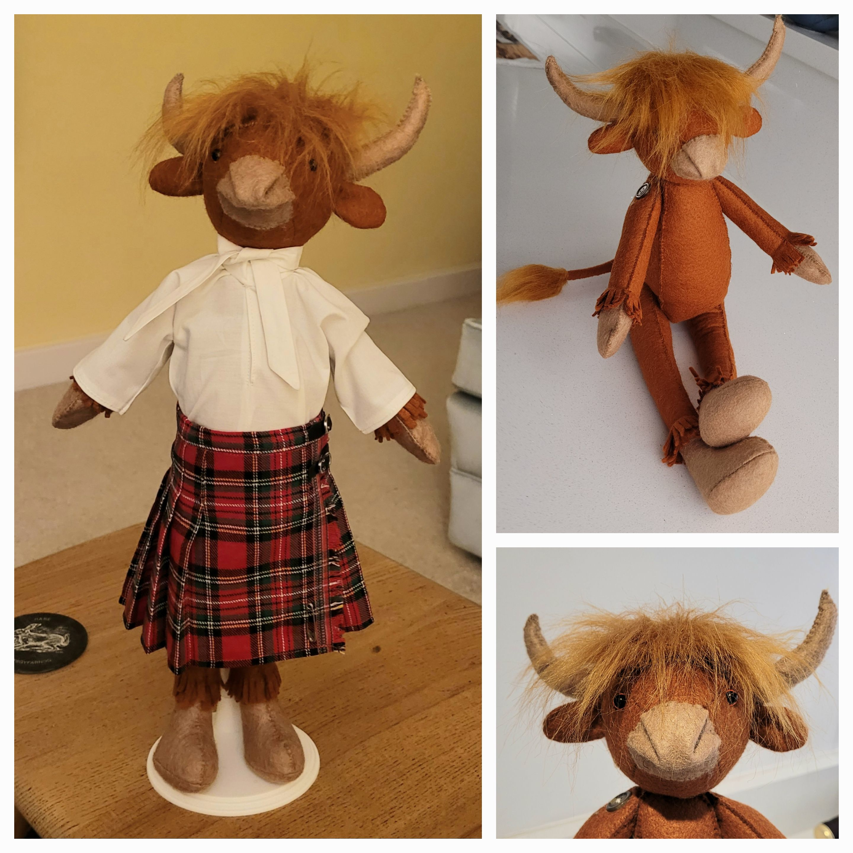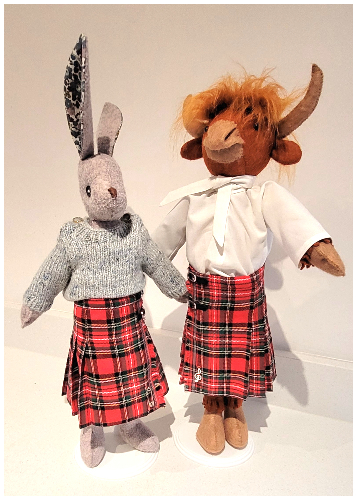 Thank goodness I had enough fabric to make another kilt, this time making sure the fringe was at the left hand side when working. I even found a charm to add as a kilt pin. And lucky Luna has a new kilt to match Hamish's. Anyway, here are the photos:
