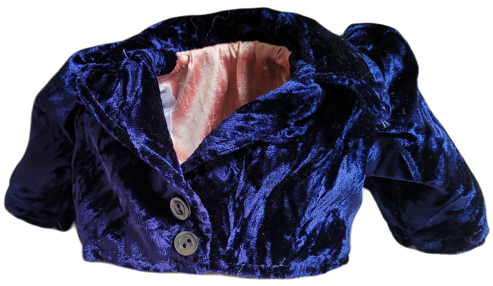 Unfortunately the velvet fabric was so fragile at the edges some of the seams split when turning through the shoulders and side seams. I had some sparkly braid to add to the edges to hide the problem areas. She is absolutely lovely and I'll be sorry to let her go.