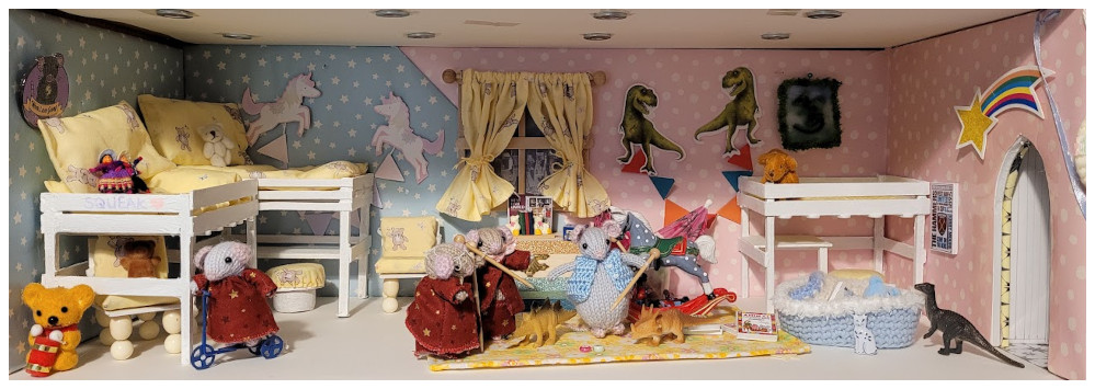 How our story began: We've already met newly retired Miss Lizzie Mouse (PhD), and the love of her life Professor Julius Cheeser. In our story, Lizzie and Julius have one daughter, Philly (full title Surgeon Commander Philippa McSqueak), who is part of the Royal Mouse Navy usually stationed on submarines. She is often away from home for very long periods of time. Philly is married to Commander Peter McSqueak (also RM Navy). We are not allowed to say much about his job, but it is something to do with MI-ce (Mousery Investigation and Counter Espionage). He too has to work away from home a lot. Philly and Peter met while they were both doing their naval training. They married about 10 years ago and have twin daughters, Pip and Squeak. Unexpectedly a teeny tiny baby mouse arrived in June 2023... When they are a family together they love to have outdoor adventures, helping the children grow up big, strong and ready to take on the challenges of the world! The twins are about seven years old (but who really knows what mouse age is). They came to live with Lizzie and Julius while their mummy and daddy were away on their last tours of duty. Squeak is a few minutes older than Pip but thinks it's at least a year. She gets into all sorts of adventures (and mischief). Squeak wants to study Botany and search for new plant species in the rain forests when she grows up. But for now she mostly likes to help Grandpa in the garden, climb trees and jump into muddy puddles - she isn't afraid of bugs and spiders! Pip is much quieter. She loves to read, especially David Attenborough's adventures. Pip has special glasses to help her short-sightedness. Pip often helps Granny in the kitchen making sure she recycles as much waste as possible. She also likes to spend time researching the effects of climate change. Pip wants to be an academic like Granny and Pappy when she grows up, using her knowledge as an environmental scientist to help the world. Baby Cam, is still at play school, but likes to hang out with Pip and Squeak whenever possible. Miss Lizzie's sister, Penny Mouse, came to stay in 2023. And finally a distant cousin, Little Finn Cheeser, joined the family in2024... The arrival of the twins, Pip and Squeak Philly and Peter McSqueak are away on their various tours of duty with the Royal Mouse Navy, so their twins have come to stay with Lizzie and Julius for a while... It's a good job Lizzie demanded a larger house with a huge bedroom/playroom on the top floor. Mama Sue very kindly made sure the twins had plenty of books and toys to play with, and she seems to have given our twins a verrrrrry mischievous streak... Click on the first image to follow more of the story with extra pictures and words.