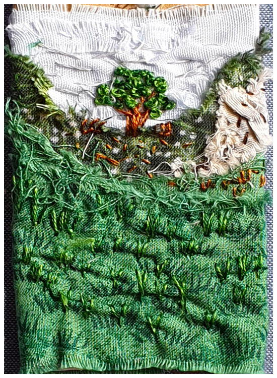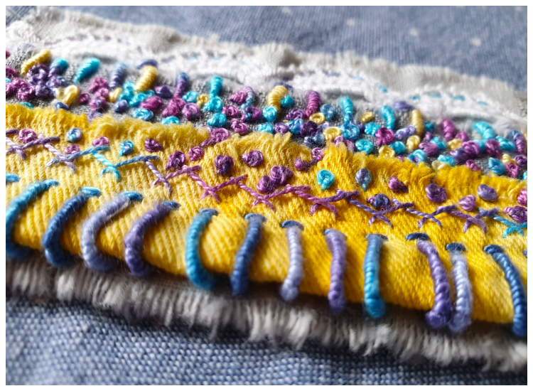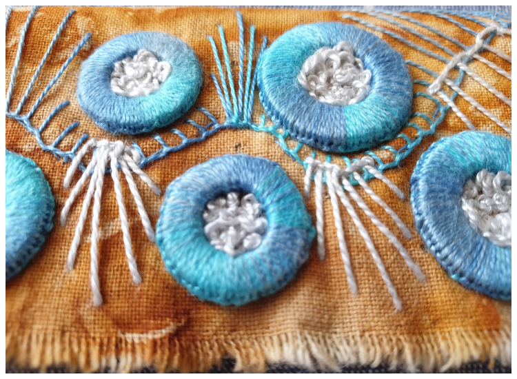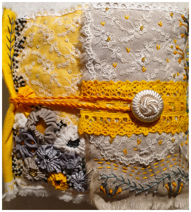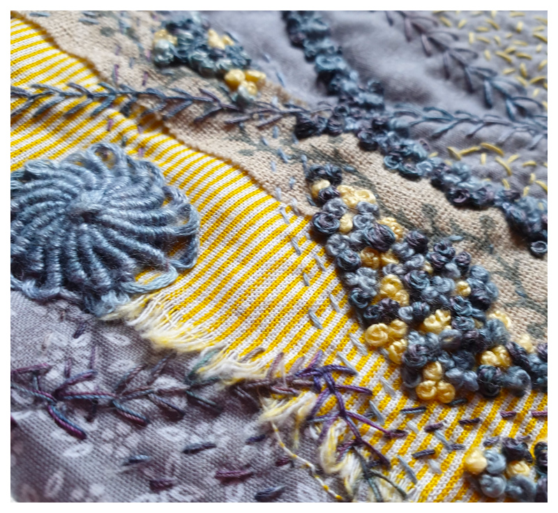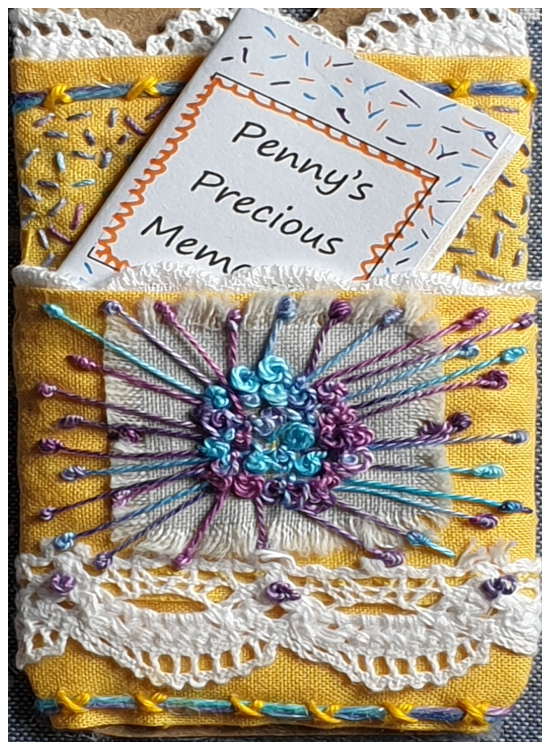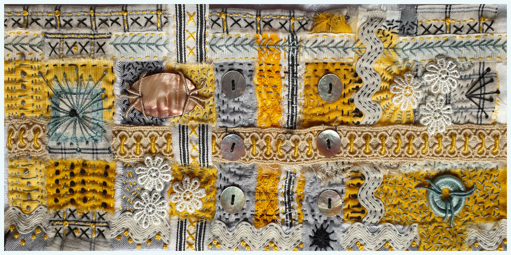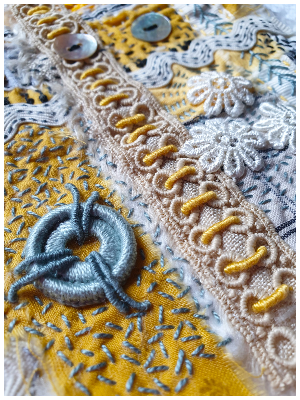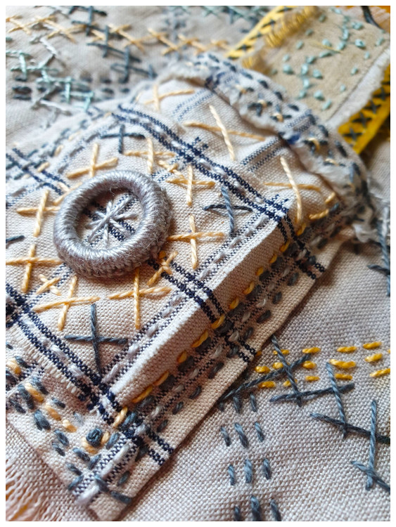 I started my book in July 2020 while I was recovering from a period of post viral fatigue. Anne had already started the new series of videos so I could enjoy watching the first three and choose one to get started. I only managed to complete two of the pages. I put the book pages aside until July 2021 when I started stitching them again... This time I could choose any of the pages to work on, coming back to less favoured ones later, and adding more details to earlier pages. I eventually finished by sew4thesoul book on 3oth September 2021. I liked this project as I could stitch a little bit at a time without having to think too much when I had another bout of PVF. The images below follow my progress. Firstly with a view of the double page (approx 30cm x 15cm), followed by close up images of my stitching. The main colour theme is yellow and grey, with additions of other colours as suggested by Anne. Descriptions of working the pages are beneath each slide.