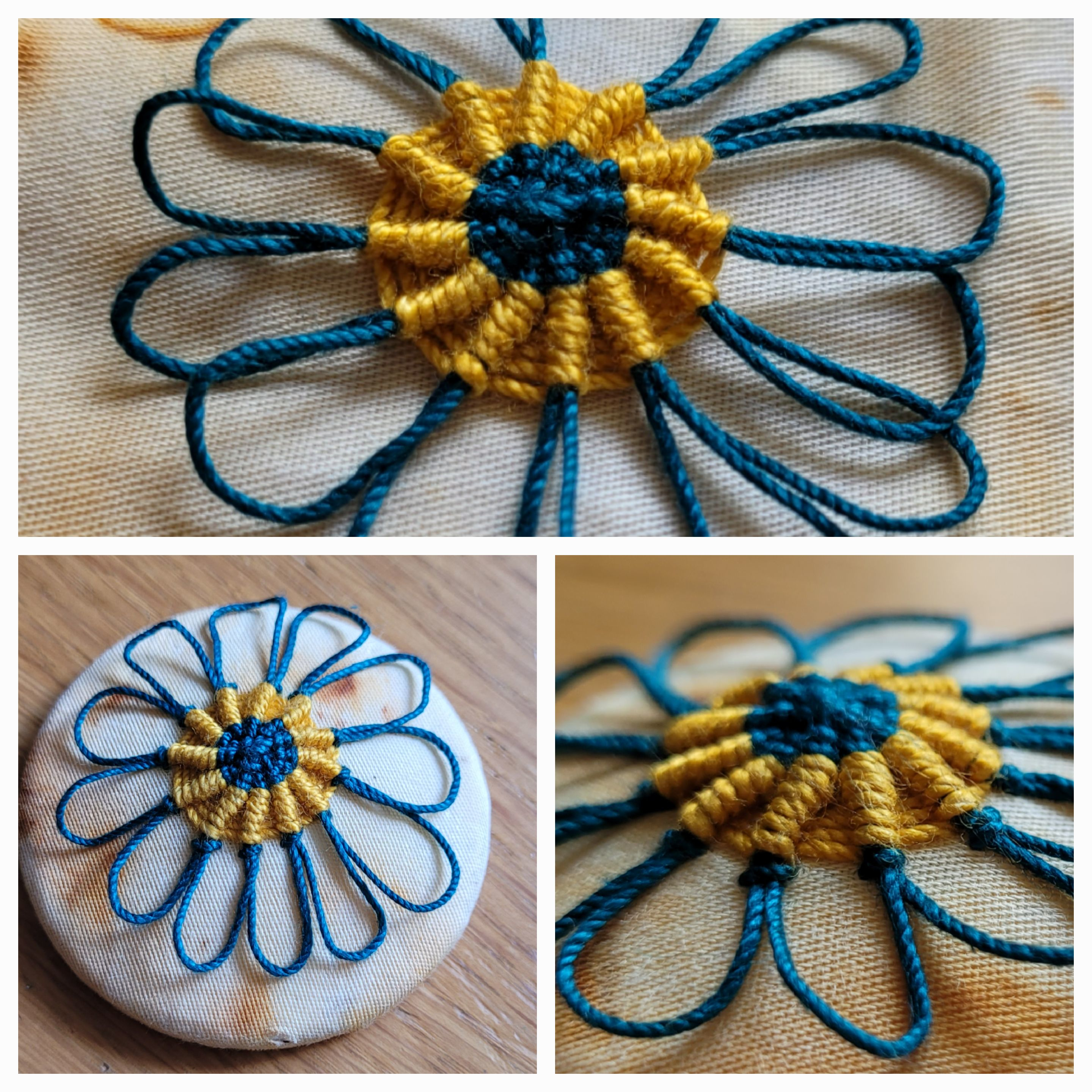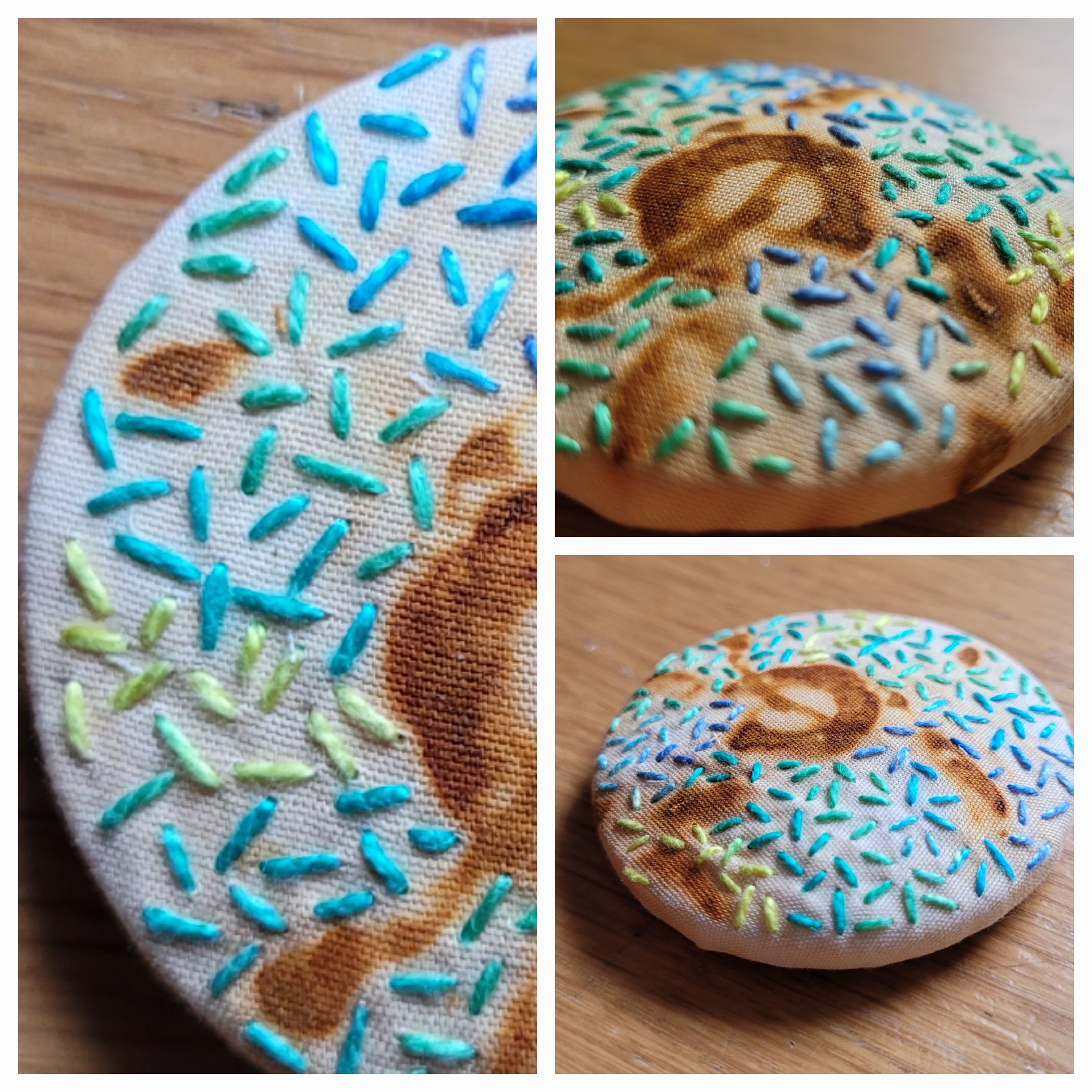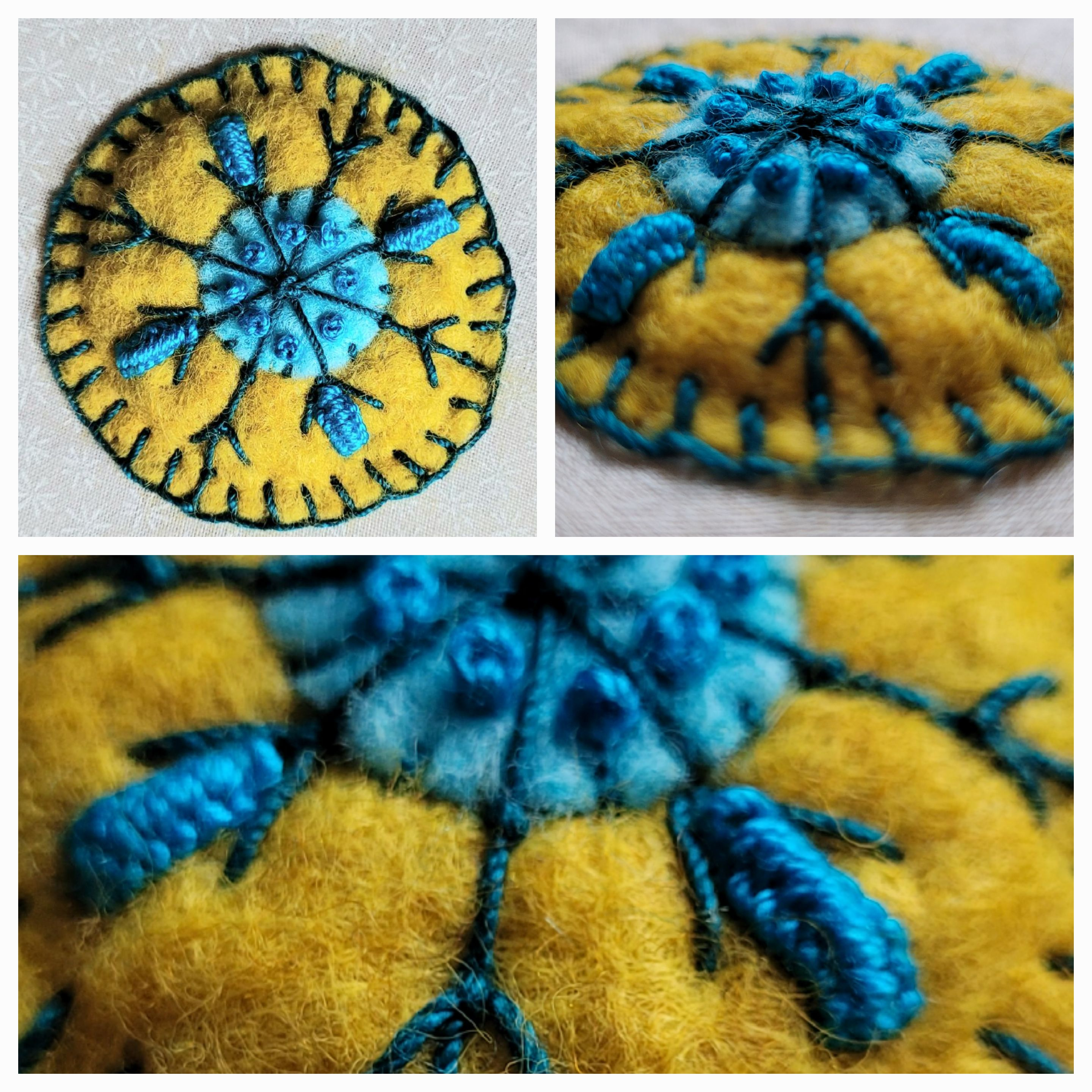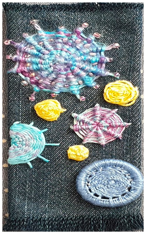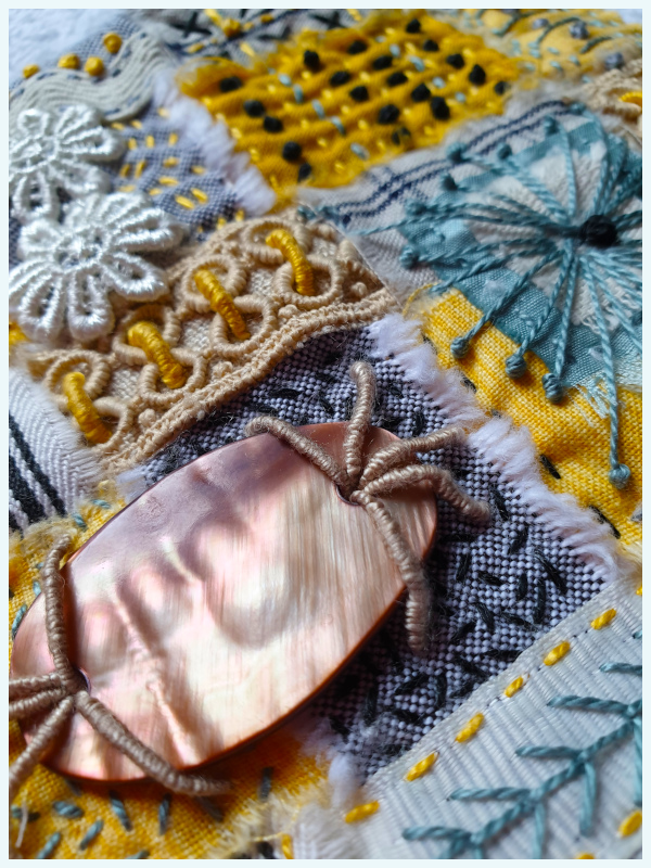 I started my book in July 2020 while I was recovering from a period of post viral fatigue. Anne had already started the new series of videos so I could enjoy watching the first three and choose one to get started. I only managed to complete two of the pages. I put the book pages aside until July 2021 when I started stitching them again... This time I could choose any of the pages to work on, coming back to less favoured ones later, and adding more details to earlier pages. I eventually finished by sew4thesoul book on 3oth September 2021. I liked this project as I could stitch a little bit at a time without having to think too much when I had another bout of PVF. The images below follow my progress. Firstly with a view of the double page (approx 30cm x 15cm), followed by close up images of my stitching. The main colour theme is yellow and grey, with additions of other colours as suggested by Anne. Descriptions of working the pages are beneath each slide.
