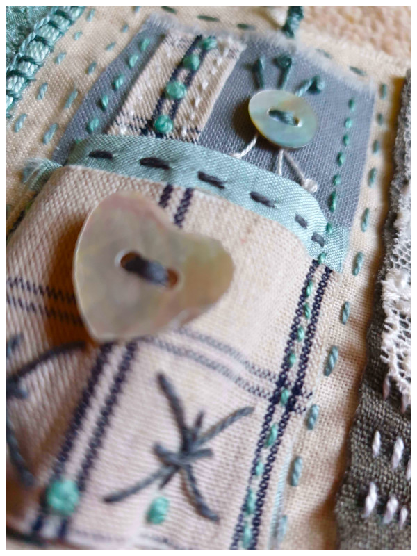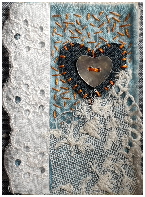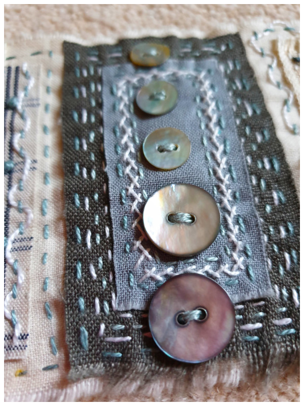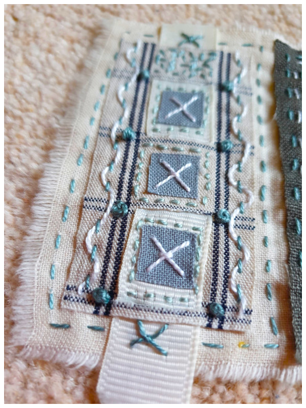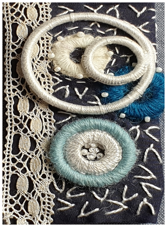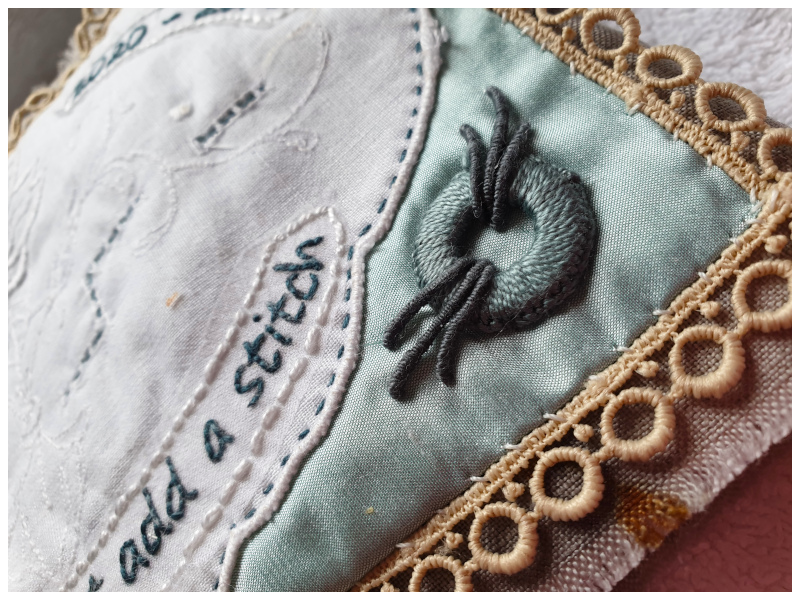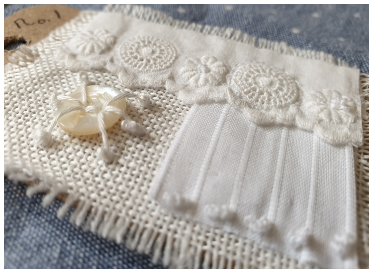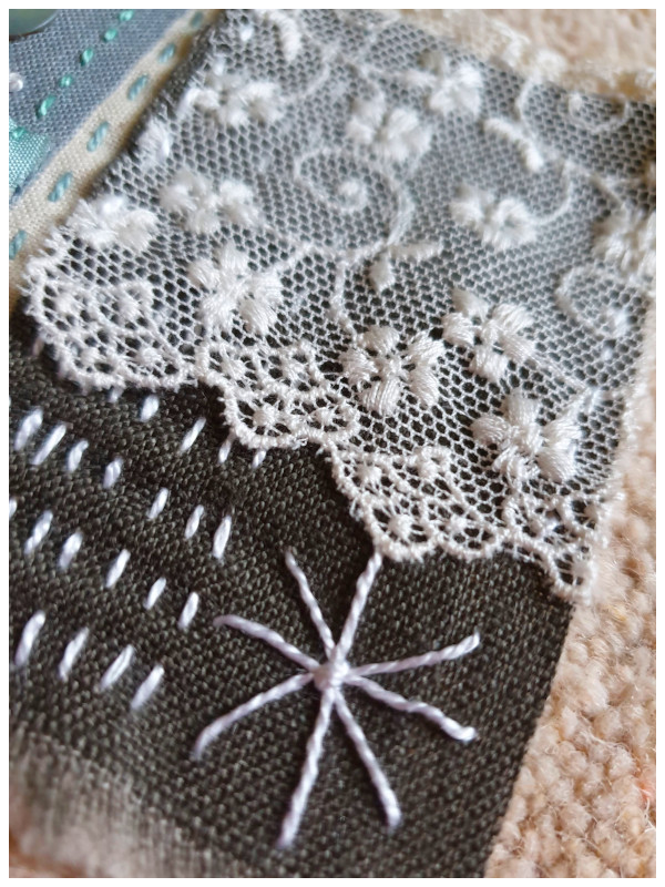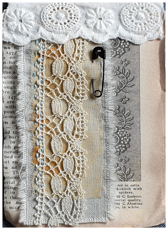Inspired by Anne Brooke #Sew for the Soul | All images of textile work on this page are my own creations, but inspired by the YouTube videos of Anne Brooke, Textile Artist #hannemadebyanne. Please respect the copyright of creative artists and do not copy or use without attribution. Like many people I lost my creative mojo during the lockdown restrictions of the 2020 Covid pandemic. For a few months nothing creative came out of the sewing room despite having a very long list of things to do. Trying to recover from the dreaded illness I started looking around for small stitching projects that would aid my recovery only using stuff already in the house and stash cupboards. Anne Brooke came to the rescue! I met her at a Guild meeting several years ago, so was familiar with her work and sense of Yorkshire humour. Anne is very generous with her time and expertise providing tutorials free on YouTube that follow her theme of sew4thesoul. She encourages us to enjoy mindful hand stitching using techniques with found objects to create beautiful textural pieces of stitched art. These few slides show some of my favourite pieces created from the #52tags prompts. Then read on for my story of participating in #sew4thesoul. Anne's first community project of 2020 was the sew4thesoul bobbin project. Using a selected colourway to work with the piece evolves over time. Starting by pinning down fabrics add simple stitch : add lace : Suffolk Puffs : Knots : Embellishments : Paper piecing : Beads and bling : Couching : Edges : Adding words : Keep extending the piece. Mine is still growing... Covid happened and suddenly confined to our homes we needed something to keep us going, Anne ramped up the videos and we stitched and stitched and stitched. In three months her bobbin project was finished (i still hadn't started mine!). As Anne became more popular on YouTube and Instagram a happy band of stitchers start sharing works using variations of the hash tag #sew4thsoul. A new textile community begins and many IG friendships form. Ever resourceful, Anne started the sew4thesoulbook project. Using similar stitching techniques and ideas from the bobbin project, we started with 30x15cm pieces of wadding that would eventually become the pages of a very chunky hand stitched book. Lockdown paused then came back with a vengeance over the winter months. Another sew4thesoul project, 12 days of Christmas started to get us through to the end of the year. And suddenly it was 1st January 2021, and yes we were still in lockdown, but eagerly awaiting vaccinations.... Anne the magnificent had another project ready. This one will take a whole year to complete! #52tagshannemade was born. Anne was so successful at motivating me to get stitching again that I started working on some of my other projects again. This meant I didn't finish my bobbin, or the sew4thesoul book, but they are there, just waiting, occasionally peaking out of the box tempting me to go back... I have managed to keep up with the tags (sometimes a few weeks late!!). Mostly the weekly prompt brought a whoop of delight with a favourite stitch or technique, others caused a bit of groan if the prompt took me out of my comfort zone (e.g. use red!). Sometimes I was inspired to create a really interesting tag, but with others I struggled to get the creative juices going... Started in 202, but put away for a very long time due to ill health. Then 'found' in 2024 to continue working on it and Finish it! Lots of gorgeous texture and stitches, but all in white, rather than colours as Anne originally used. I think I managed to use all the prompts Starting by pinning down fabrics add simple stitch : add lace : Suffolk Puffs : Knots : Embellishments : Paper piecing : Beads and bling : Couching : Edges : Adding words : Keep extending the piece. My roll is approximately 80cm long.